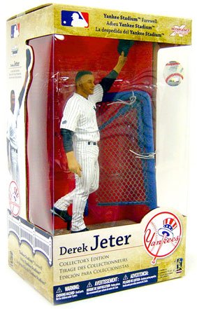 Salute the Yankee captain! Celebrate the opening of the new Yankee Stadium! A must have for any Yankee fan! This 6-inch scale plastic action figure commemorates Jeter's salute to fans at the final game played at Yankee Stadium on September 21, 2008. Ball cap replaces batter's helmet from limited-edition Jeter Fan Fest figure. Base includes stairs, railing and netting.