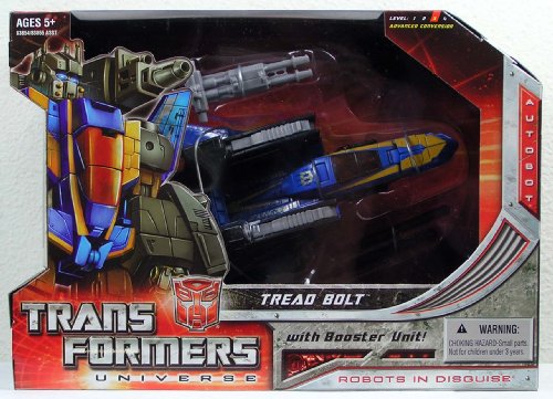 Take command of your TransFormers collection with this TransFormers Universe Voyager Class Tread Bolt AUTOBOT ally figure that converts from menacing robot mode to stealth jet mode and back again! Put on this guys helmet and engage the arm blasters projectiles in detailed robot mode. Change into jet vehicle mode for rotating laser cannons! Use your imagination and your advancedconversion skills while staging your own AllSpark adventures with this futuristic robottovehicle character.
