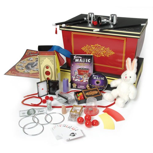 There will be magical fun with the 250 tricks that can be performed with this set. Kids can make scarves appear, pass balls through solid cups, and more. A few of the professional props are: Wand, Production Tubes, Phantom Deck, Chinese Sticks, Linking Rings and a sturdy cardstock performance table. Comes with instructions, poster and a 90 min. DVD showing rare footage of legendary magicians and visual instructions. Table measures 19 L. x 14-1/4" W. x 15" H. Assembly required. Ages 7 yrs. +."