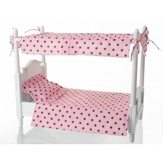 Heavy lids bring dreamtime in this luxurious doll canopy bed. Snuggling in with matching peach linens and canopy cover, will entice the sandman to visit and bring sweet dream to your girl’s doll. All wood construction the bed features a white finish.